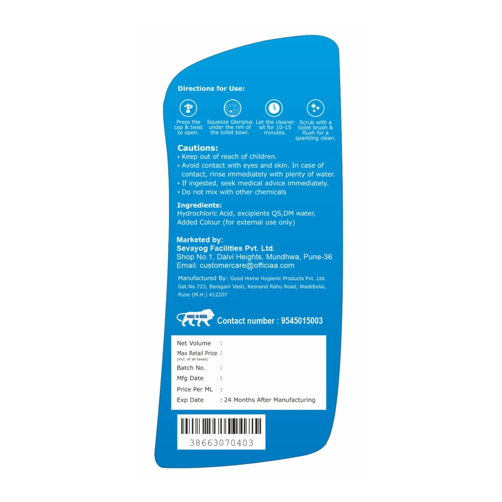 Cleenvo Toilet Cleaner Liquid is designed to remove stains, eliminate odours, and disinfect toilets. It is an essential household item that helps to maintain good hygiene and prevent the spread of germs and bacteria in the bathroom. Regular usage of this product can help prevent the build-up of harmful bacteria and ensure a clean and hygienic environment in your bathroom. Our toilet cleaner complies with IS:7983 specifications.